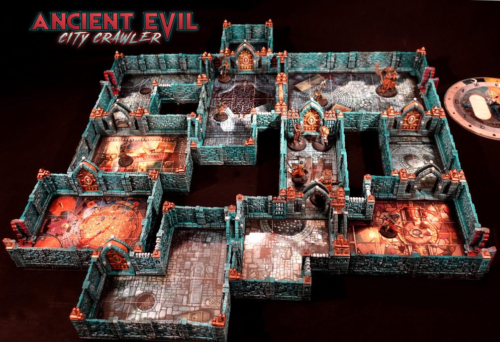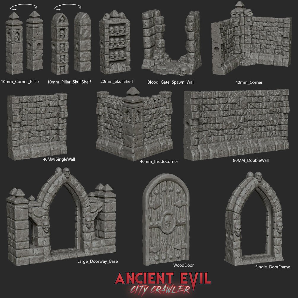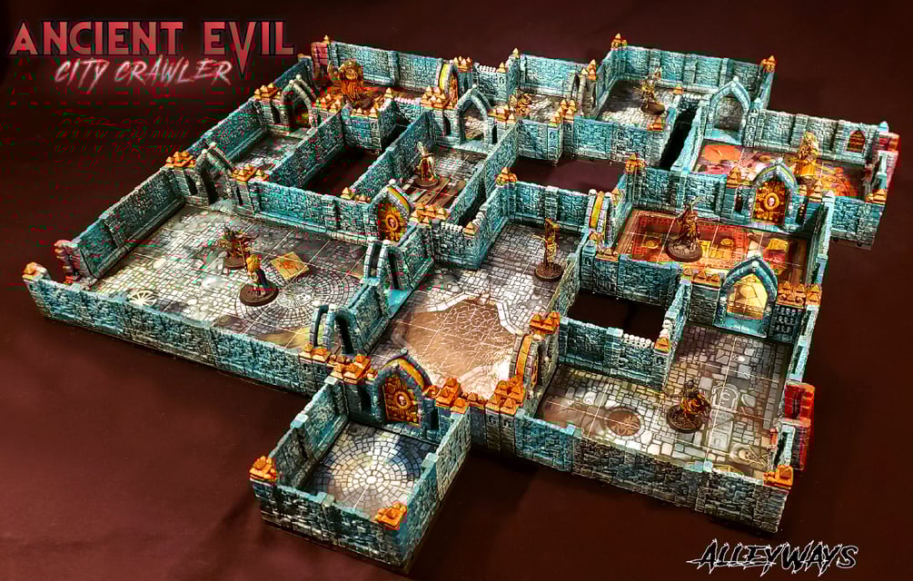 The Ancient Evil City Crawler is a set of 3D printed Terrain that is magnetically connected for fast game space assembly. It is designed to enhance the gameplay experience of Games Workshop's 'Warhammer Quest: Cursed City'. The Ancient Evil City Crawler can also be used as a stand alone Dungeon Crawler on a 40mm Grid, as well as an enhancement for a variety of existing Dungeon Crawler style boxed games.